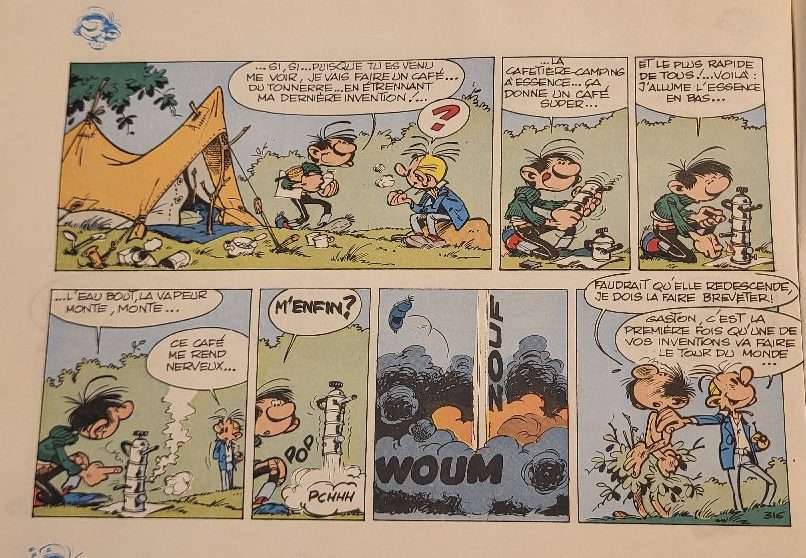 C’est dans la planche 316, parue en 1973 dans l’album R3 et probablement dessinée en 1964 que l’on découvre une invention de Gaston qui a fait grand bruit: la cafetière de camping à essence! Le principe est simple, Gaston crée une sorte de cafetière napolitaine avec un réchaud à essence intégré. Sauf que la cafetière se transforme en fusée, prête à faire le tour du monde selon Fantasio!