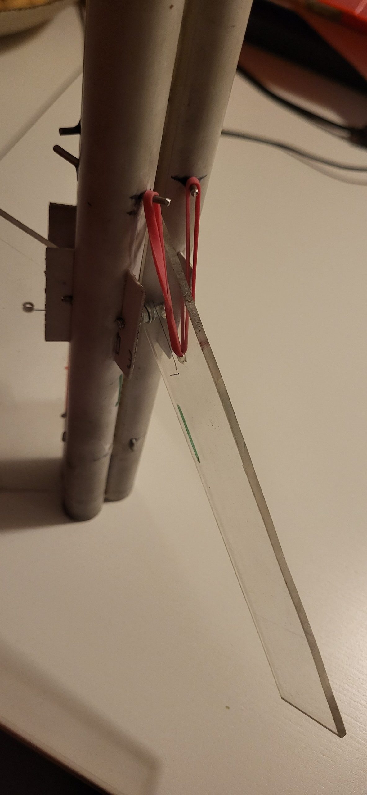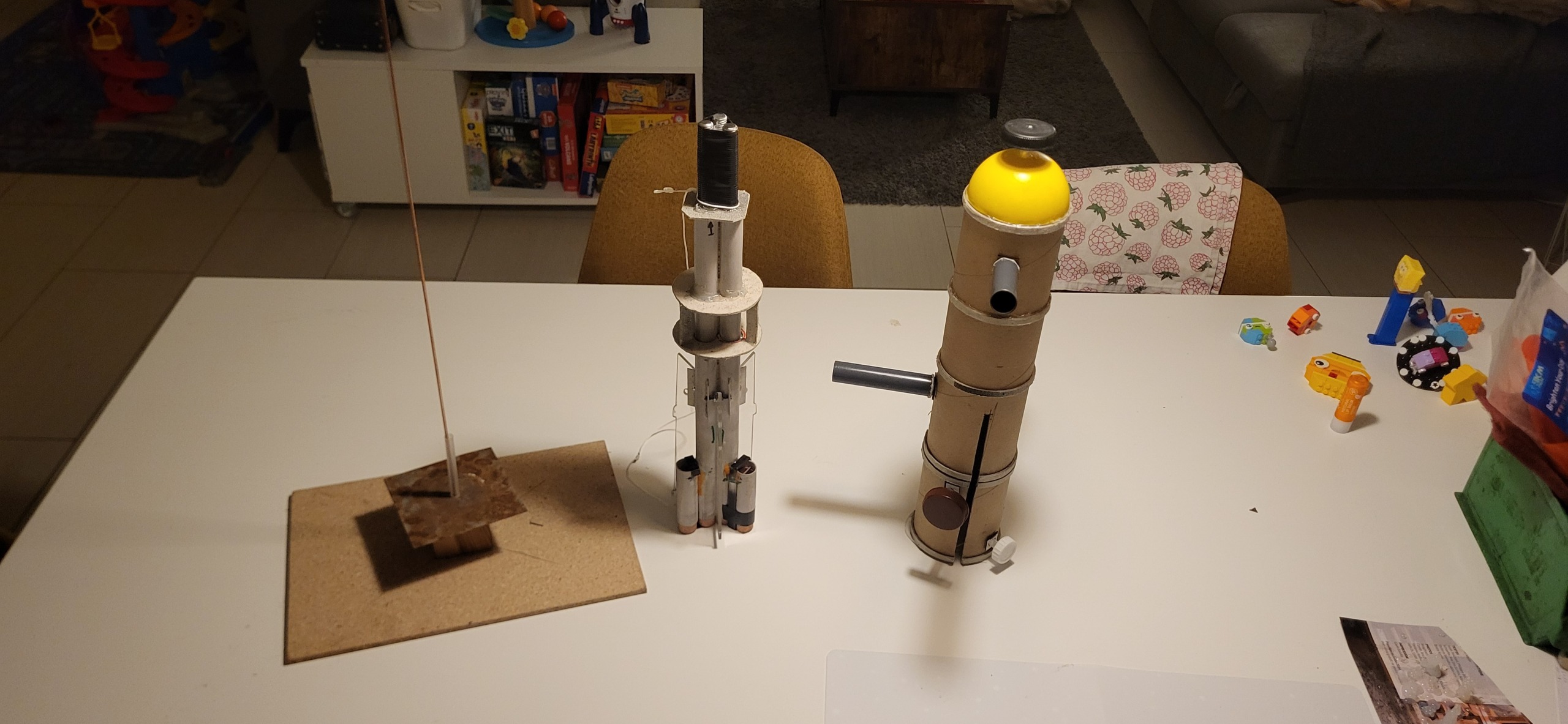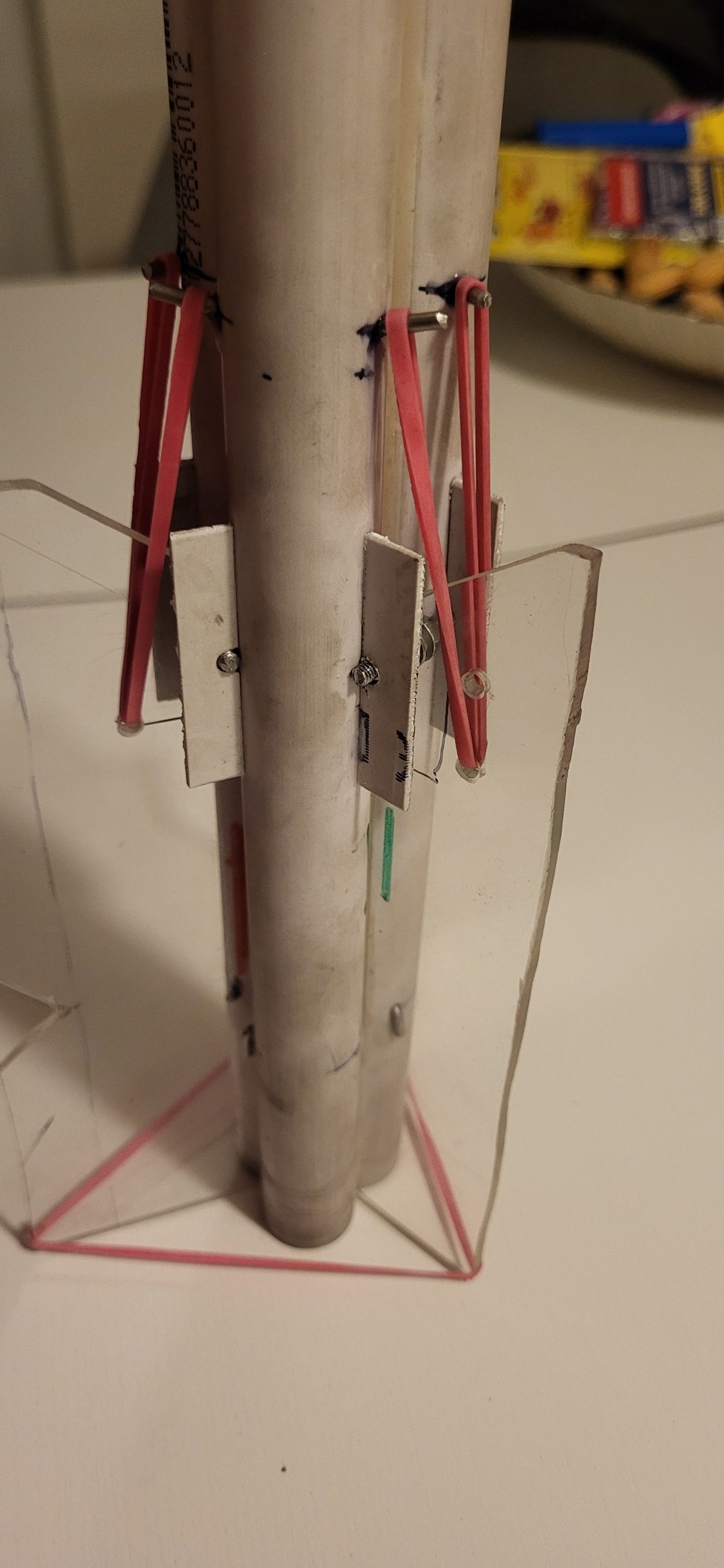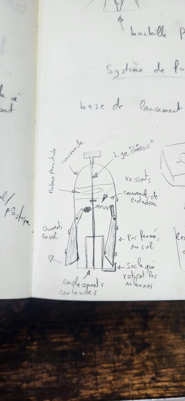 Dans les faits, plusieurs erreurs de conception ont mené à l’atterrissage brutale de mon aéronef: la structure interne n’était pas optimale, notamment avec ma décision de faire passer la tige de guidage de la base au centre de la fusée, ensuite j’ai dû lester l’ogive de la fusée afin d’assurer l’équilibre à cause des ailerons placés trop haut, et à cause de ce poids supplémentaire j’ai dû augmenter la surface du parachute. Et pour finir, j’ai mal fixé les moteurs, et c’est ces derniers qui ont été éjectés à la place du parachute!