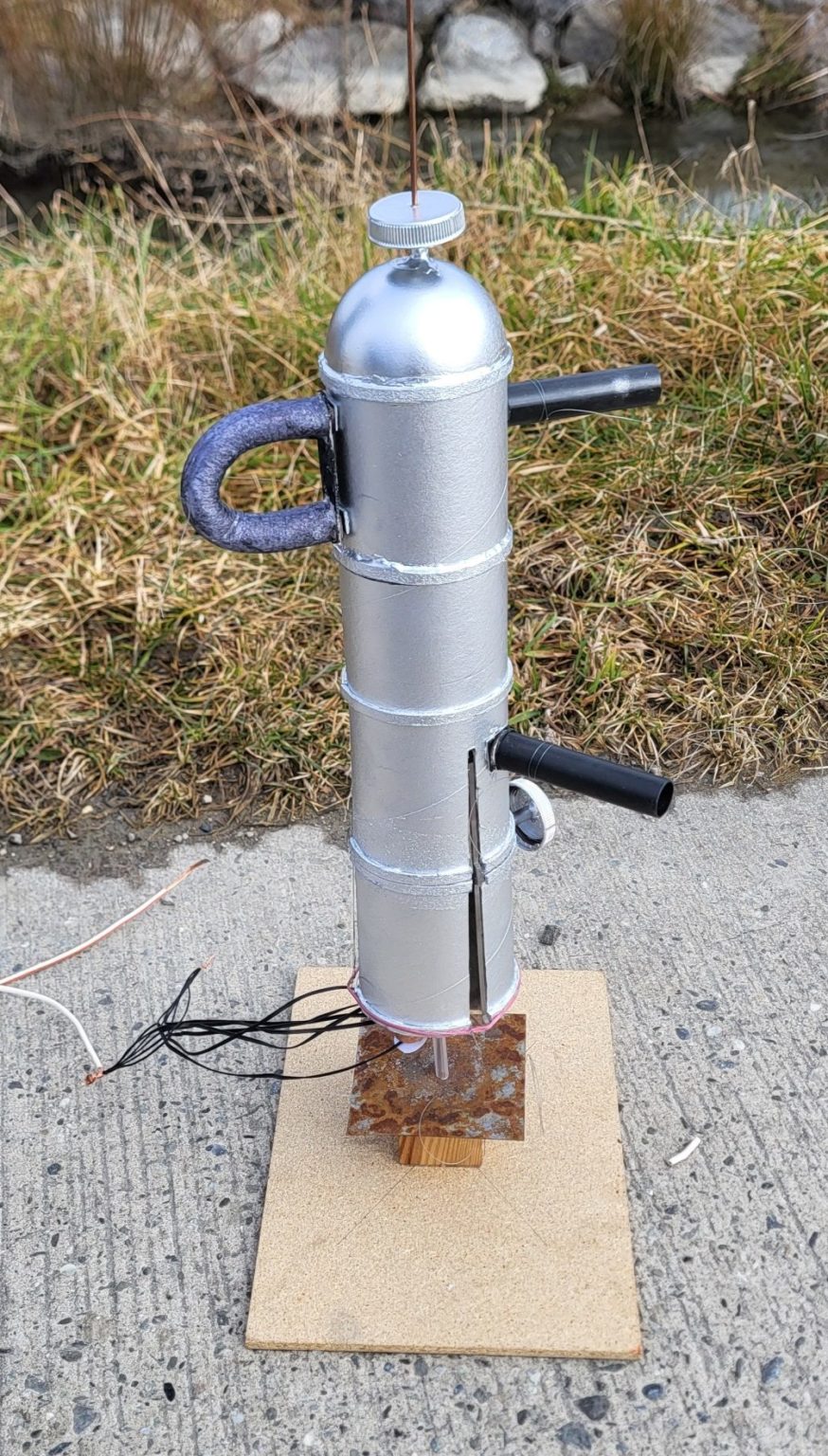 Le corps de la fusée est en carton, et le châssis intérieur est en tubes PVC. Pour garder au maximum le look cafetière de Gaston j’ai décidé d’inclure des ailerons rétractables et transparents, en plexiglass, qui s’ouvrent quand la fusée décolle! Pour favoriser l’aerodynamisme de la fusée pendant son vol, j’ai fait en sorte que les accessoires de la cafetière (poignée, bec verseur, boutons de réglage) se détachent lors du décollage. La propulsion de l’engin est assurée par l’usage de 6 moteurs C6-3 à allumage électrique. Un parachute orange de 80cm de diamètre a été intégré dans la coiffe, et une base de lancement a été confectionné par moi-même. Quelques calculs sommaires et un test d’équilibre dynamique ont été effectués mais je n’étais vraiment pas sûr du déroulé correct du vol!