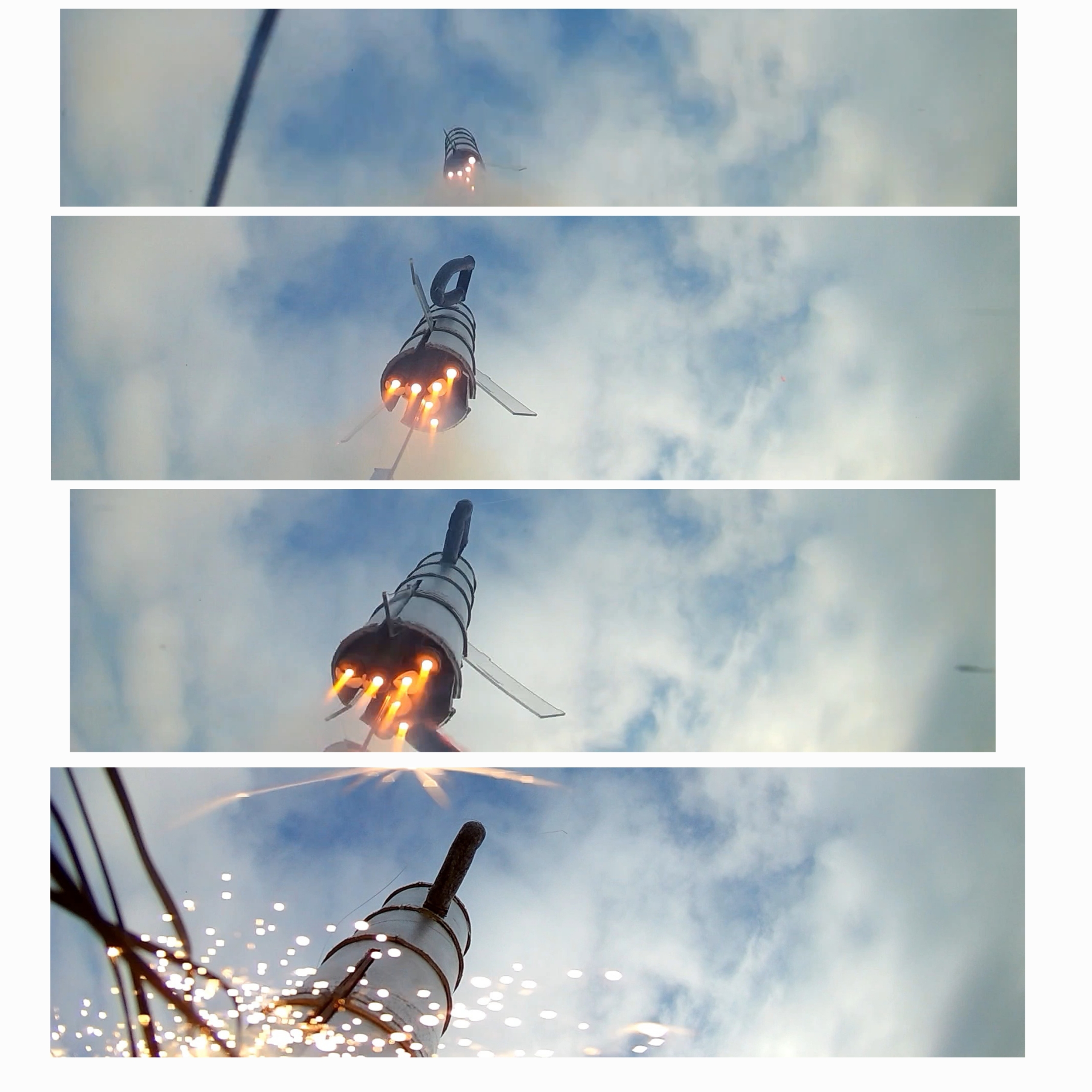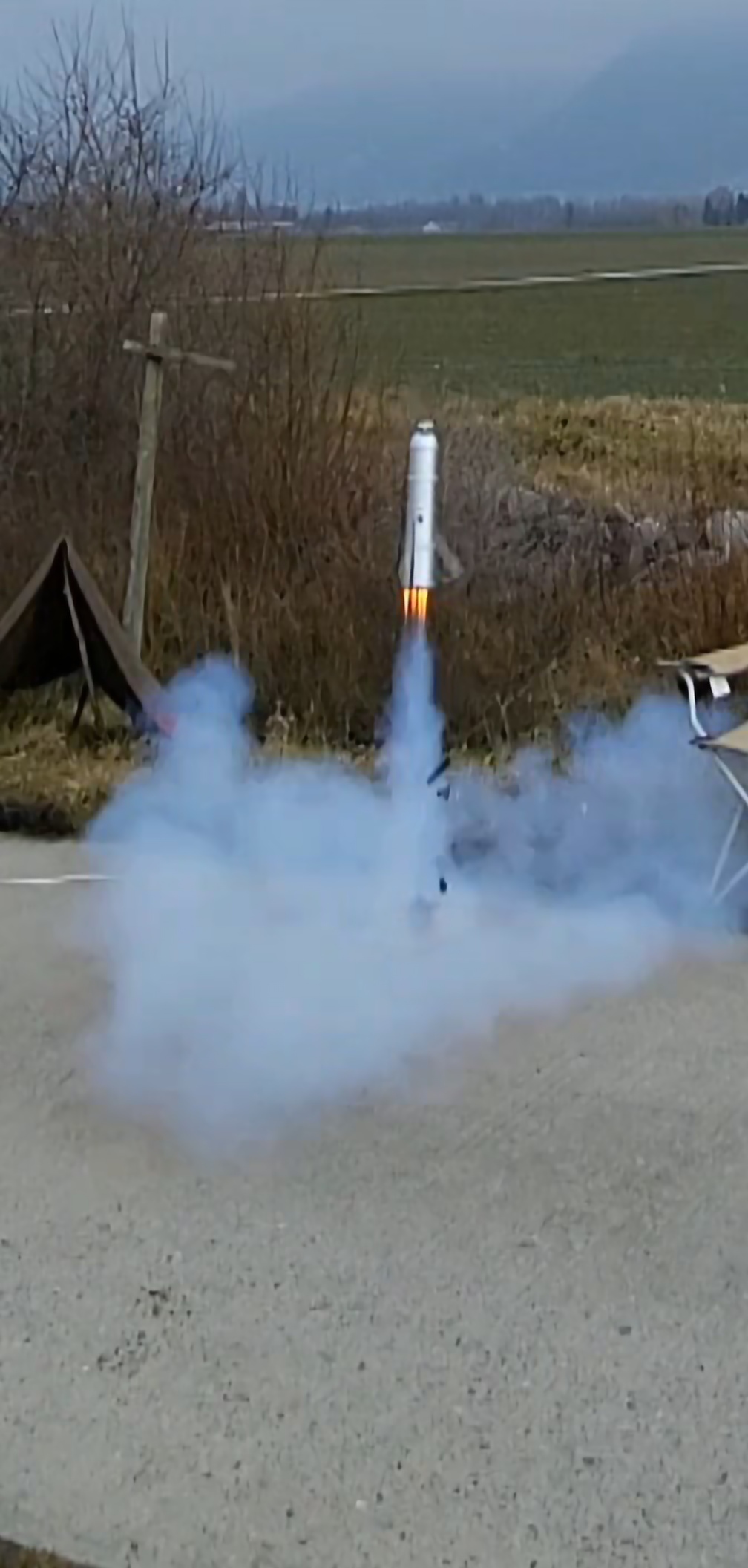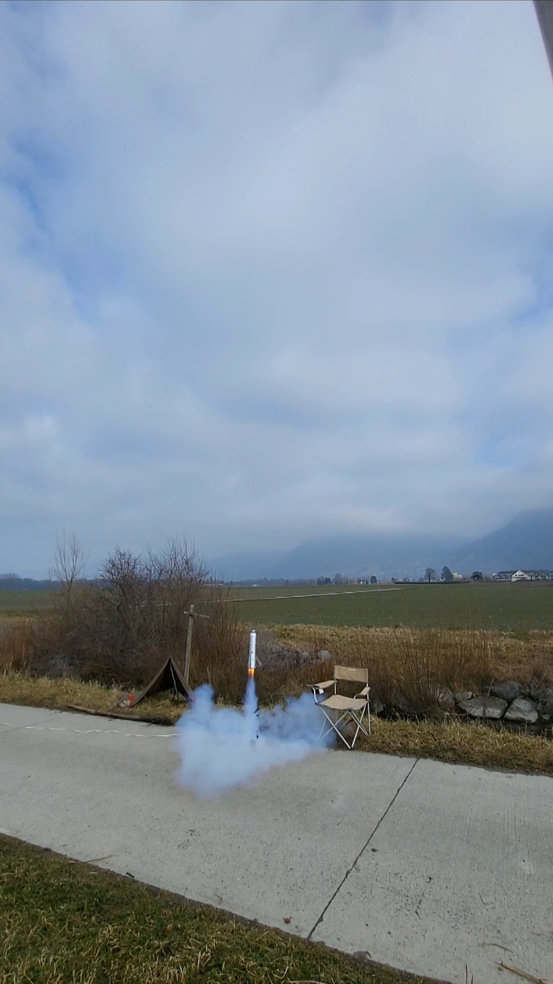 « 5… 4… 3… 2… 1… Mise à feu! » Et donc, le samedi 18 janvier 2025 à 12:18 ma fusée décolle furieusement et s’élève majestueusement en direction des cieux! J’estime l’apogée de ma fusée à environ 120 mètres…