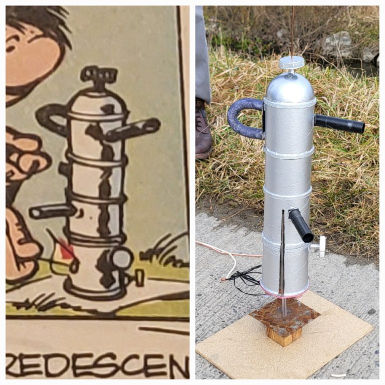 Pour la suite, j’ai vraiment envie de refaire non pas une, mais deux fusée-cafetières; une à moteurs à poudre classiques, mais avec un corps en plastique et une structure interne mieux pensée, et une version à essence, exactement comme dans la BD même si elle n’ira pas aussi haute que celle à poudre.