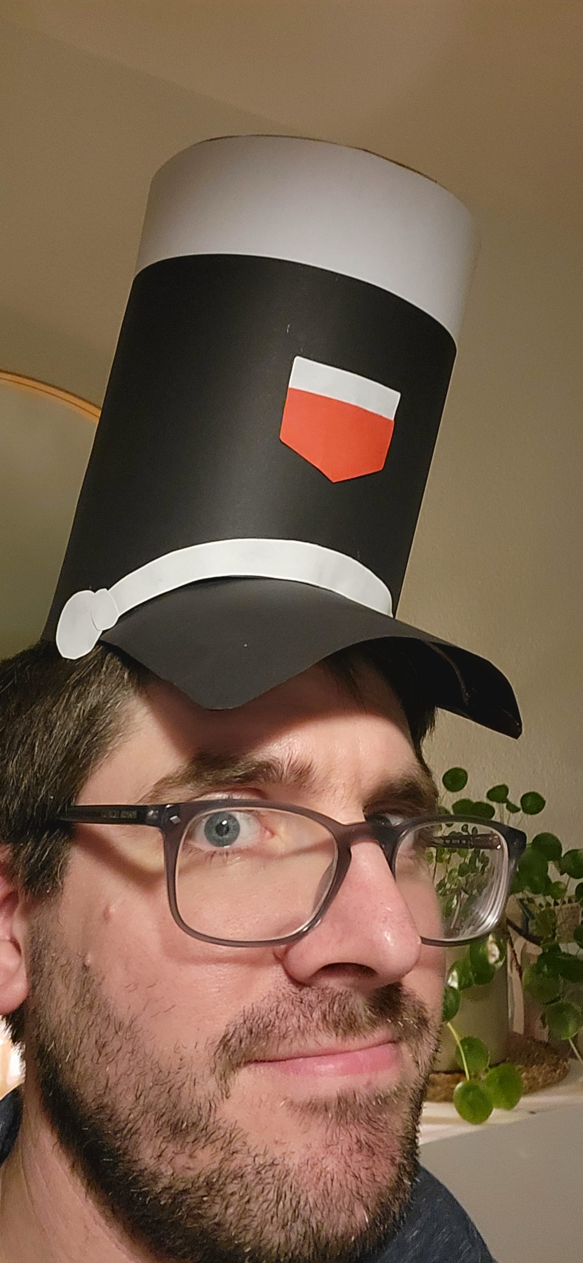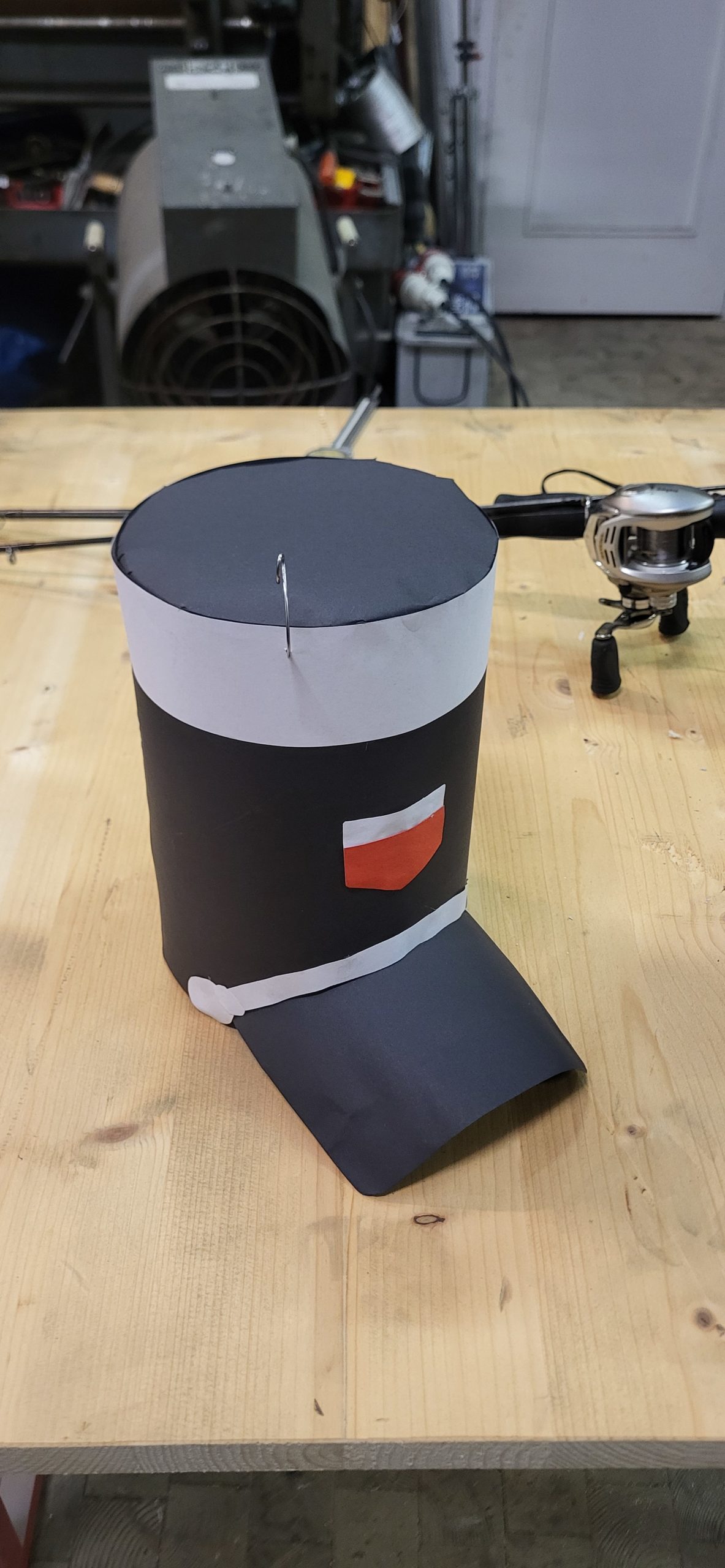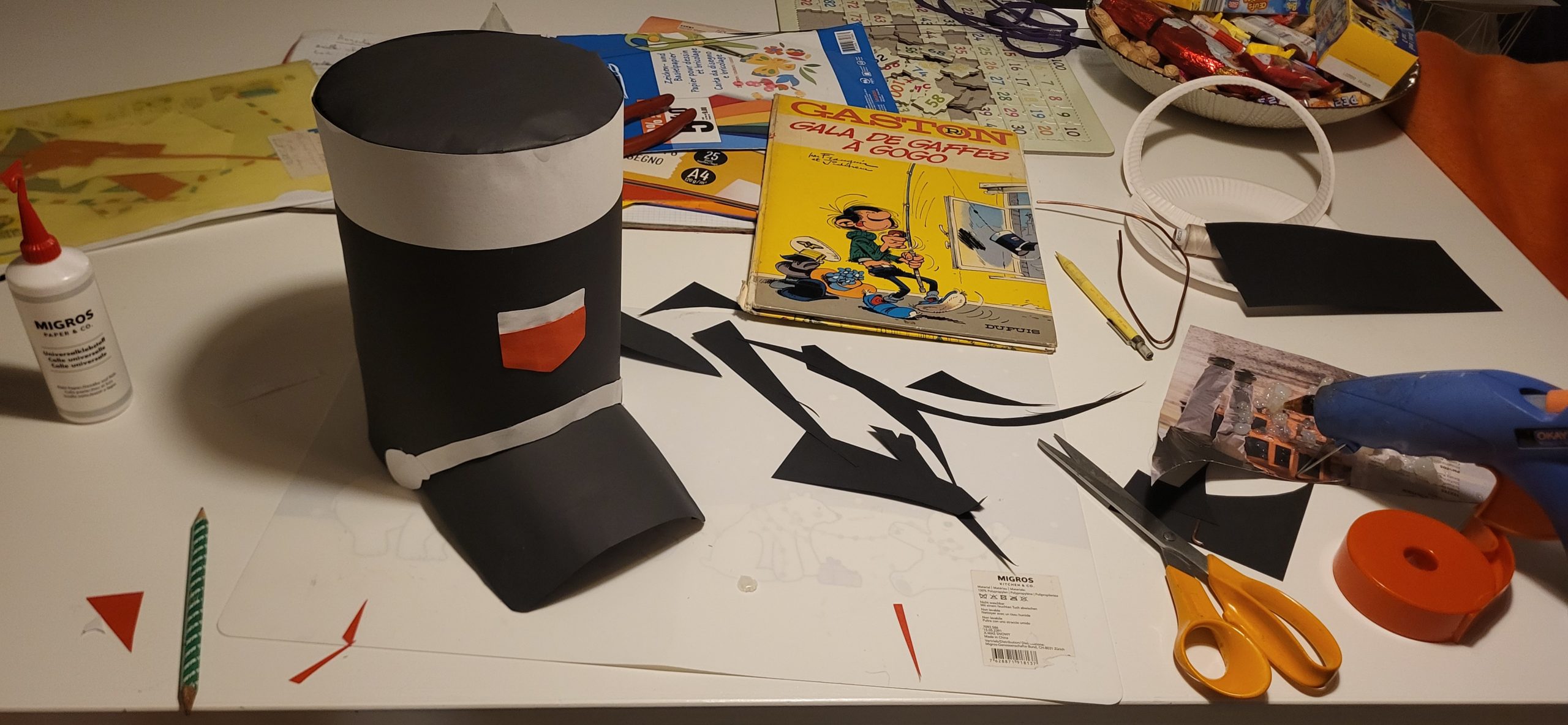 A l’été 2024, j’ai eu la chance de pouvoir récupérer plein de matériel d’une grange qui devait être vidée. Dans le lot, coup de chance une superbe canne à pêche neuve, encore emballée! Ne pratiquant pas la pêche, j’ai tout de suite eu en tête l’image de Gaston sur la couverture de l’album R1. Je me suis armé de mes plus beaux ciseaux, de colle chaude et de papiers colorés pour fabriquer une réplique du képi de Longtarin tel qu’il apparaît sur l’album. Une bonne soirée de travail plus tard, je suis assez fier du résultat!