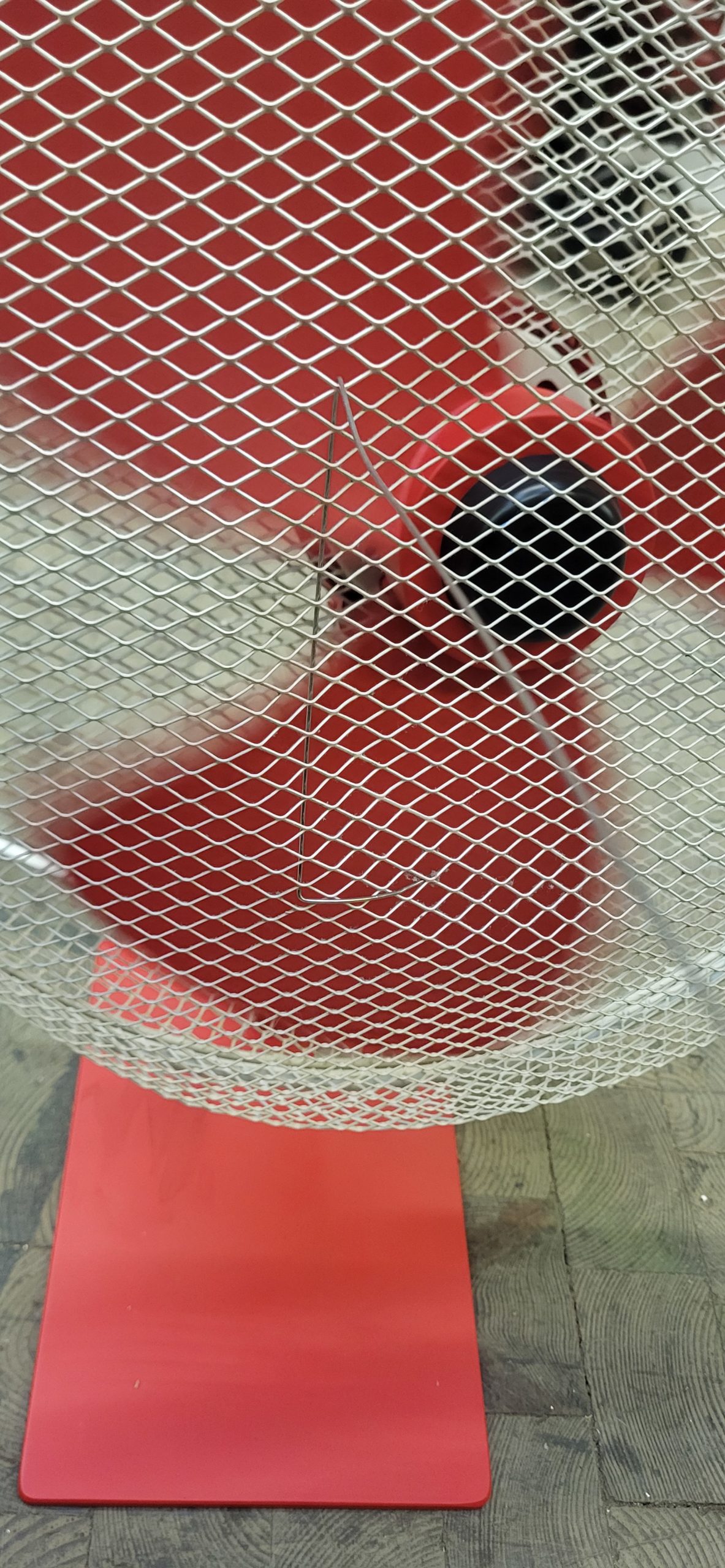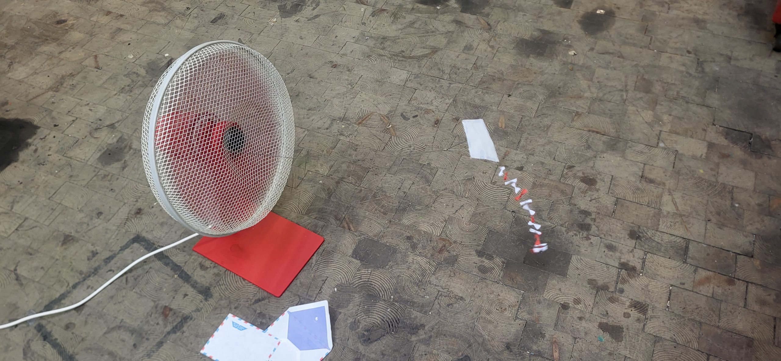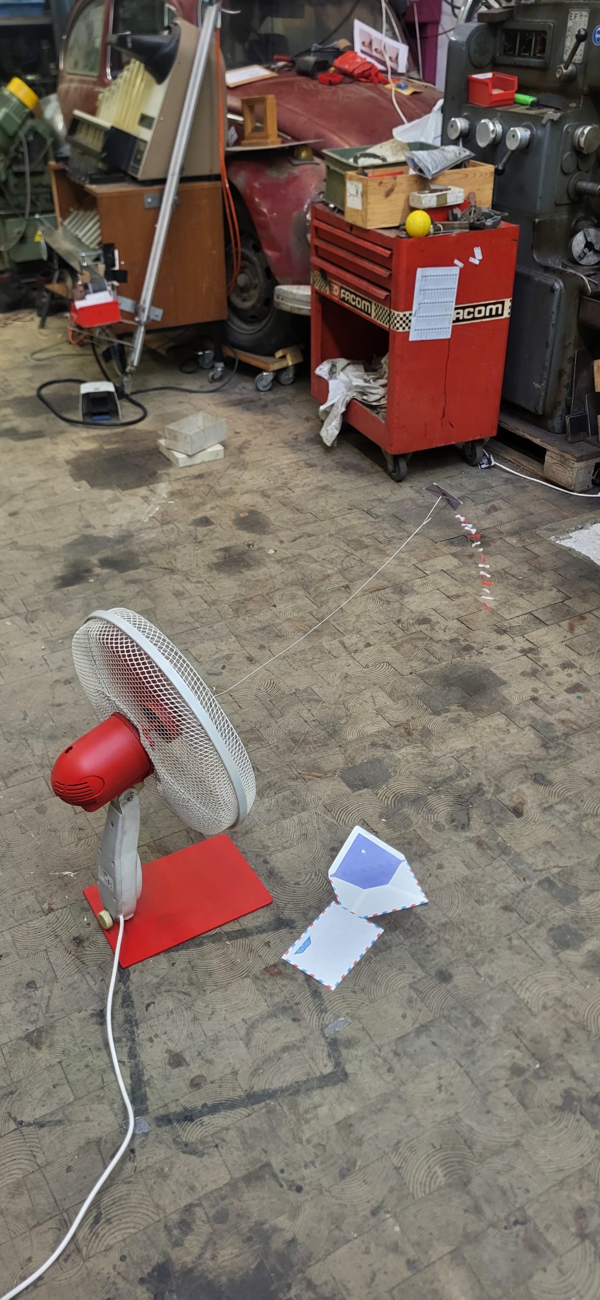 Pour faire l’objet en réel, tout a commencé par la découverte dans mon atelier d’un stock d’enveloppes en papier léger pour avion, de couleur bleues! J’ai récupéré ensuite un vieux ventilateur qui a été repeint par mon ami Nicolas, et j’ai commencé la construction du cerf-volant avec des cure-dents. La queue du cerf-volant est composée de noeuds en papier, et la séquence des couleurs est identique au dessin. La seule liberté que j’ai prise concernant la BD est le remplacement de la ligne par un fil de fer, en effet il est impossible de faire réellement voler un cerf-volant avec un ventilateur qui produit un vent tournant…
